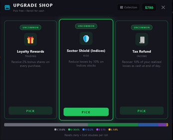- Daily upgrade picks with 5 rarity tiers, a permanent shop, and sector-specific bonuses